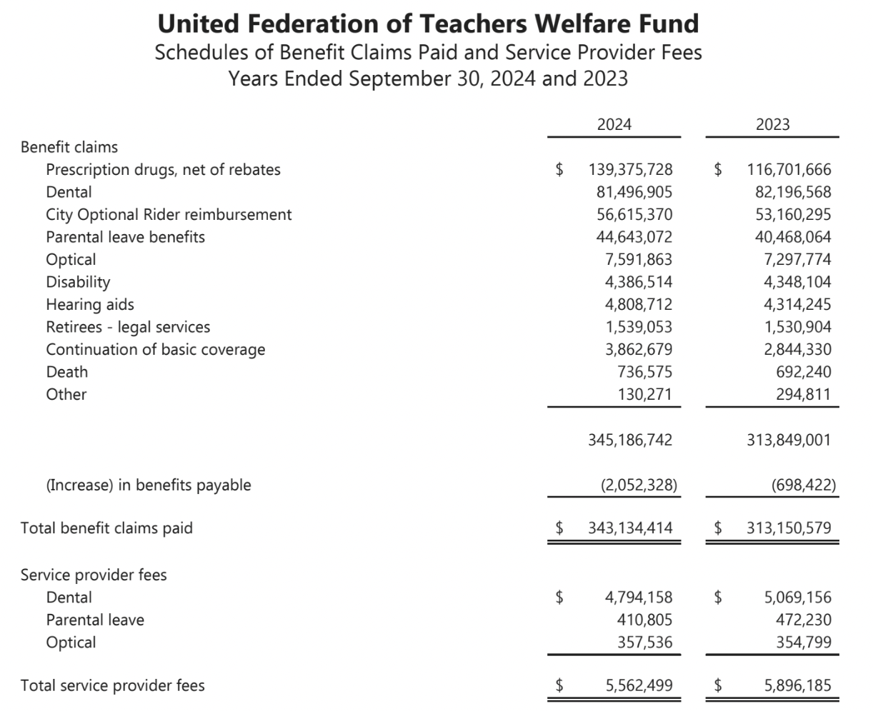 Thus far, this kind of detailed information about the welfare fund has not been available to members—the UFT has only published an annual report in the back pages of the New York Teacher once a year that only divulged top-line information available elsewhere. The lack of transparency only increases questions and confusions in the membership. Below is information about how the welfare fund spends its money - mostly on prescription drugs ($140 million), unsurprisingly, while the payouts for dental ($81 million), optical ($7 million) and hearing ($4 million) are comparatively small. Of course these numbers will increase slightly with the recent expansion of benefits rolled out during the most recent UFT election season. But imagine what we could do if we stopped stockpiling money and spent some of it on benefits! $75M annually would almost double dental benefits.